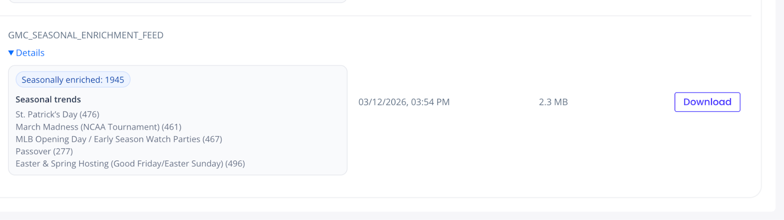 A leading adult beverage retailer uses the new “Feeds View” in the portal to look at specific seasonal events enriched by Optiversal, including the total number of products that were enriched.