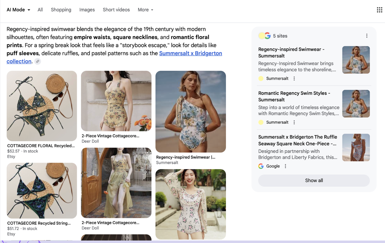 For example "Regency style swimsuit for spring break" with Summersalt as the first example in Google Shopping and Google's AI Mode: